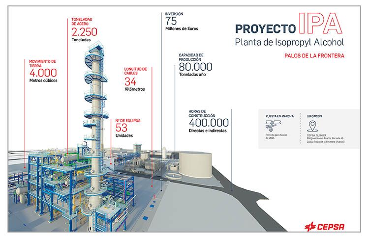 Por primera vez en España, se va a construir una planta de producción de alcohol isopropílico (IPA). La impulsa Cepsa y requerirá una inversión de 75 M€. El IPA es un producto base de los geles hidroalcohólicos que también se emplea en productos de limpieza para hogar e industria. La planta será la primera instalación de este tipo en España que utilice hidrógeno verde y que sustituirá materias primas de origen fósil en la producción por materias primas sostenibles.